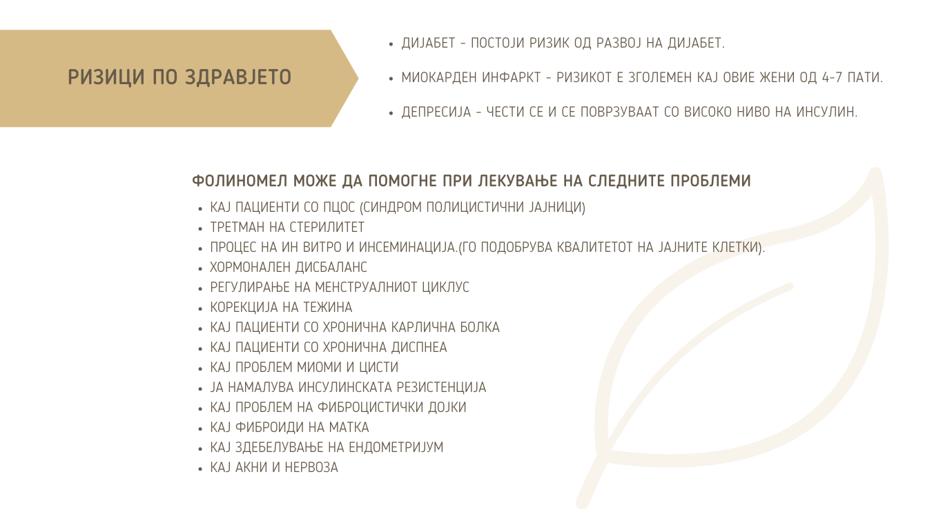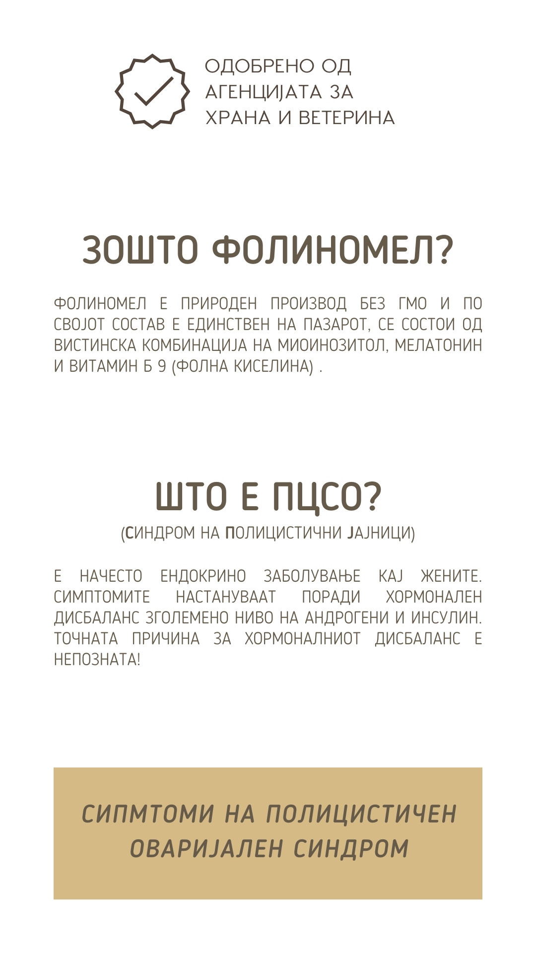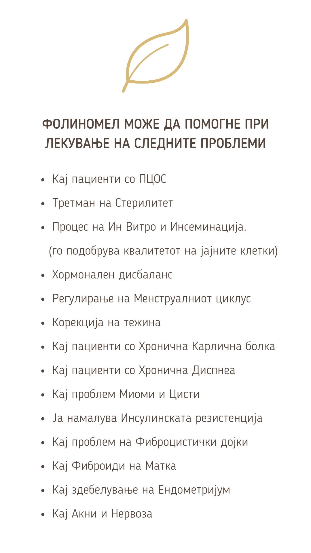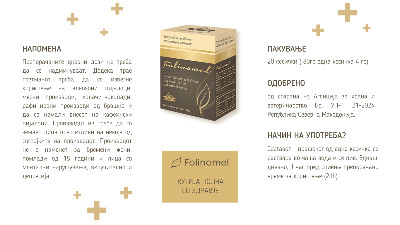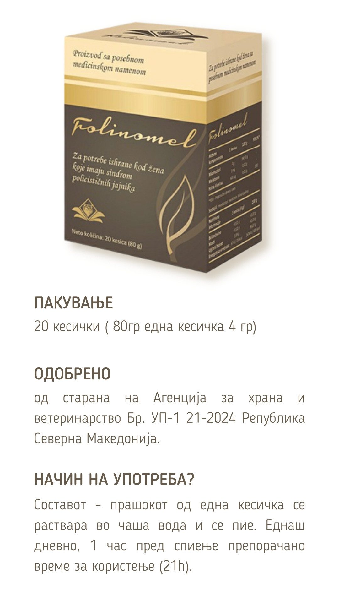 Фолиномел е природен производ без ГМО и по својот состав е единствен на пазарот, се состои од вистинска комбинација на миоинозитол,мелатонин и витамин Б 9 (фолна киселина).